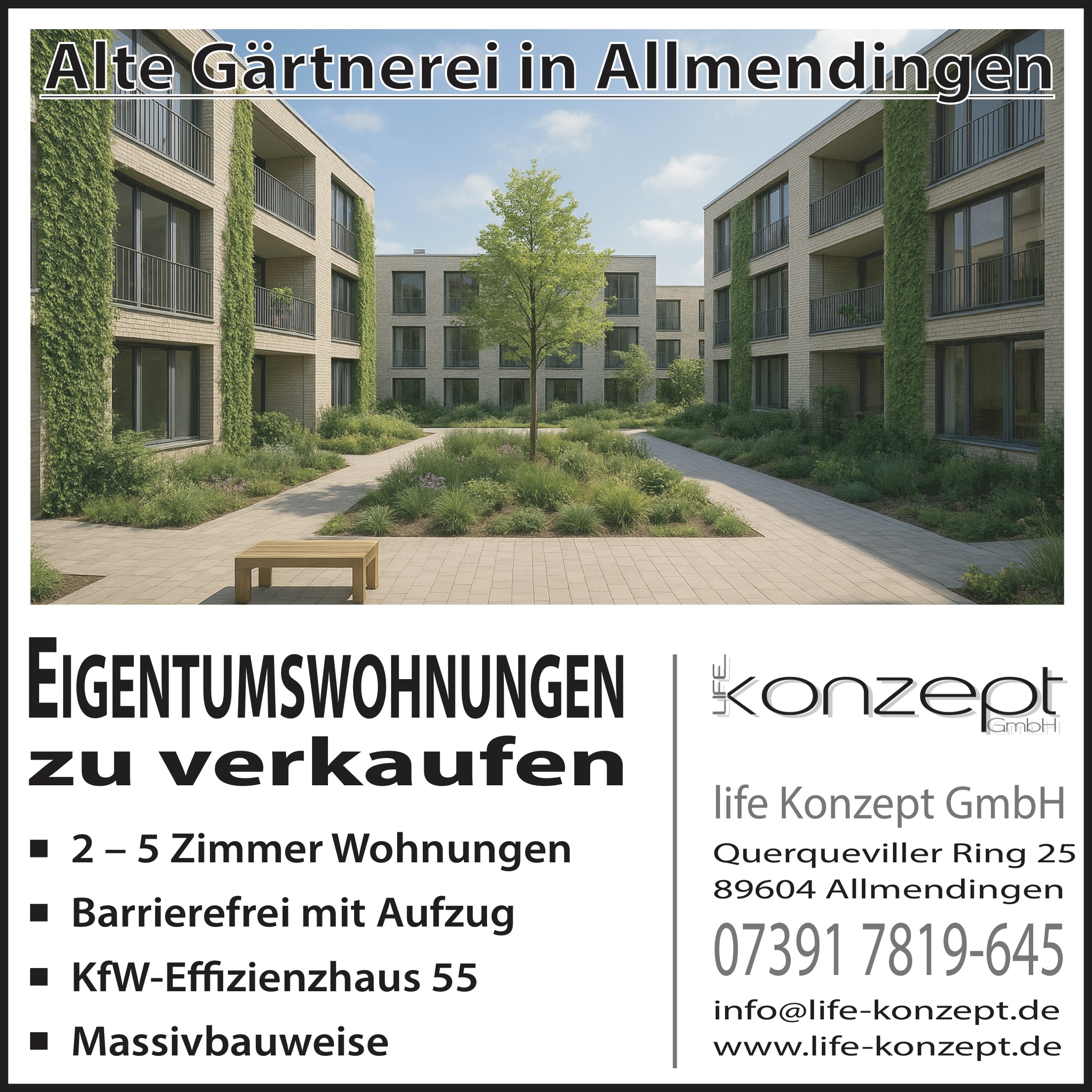 Sie möchten modern Wohnen oder Ihre Altersvorsorge sichern und interessieren sich für eine Wohnung in der "Alten Gärtnerei" in Allmendingen. Dann reservieren Sie aus unserem vielseitigen Angebot die Wohnung, welche Ihren Vorstellungen entspricht. Wir können vor Baubeginn noch auf Ihre Wünsche eingehen und eine individuelle Wohnraumgestaltung für Sie planen.