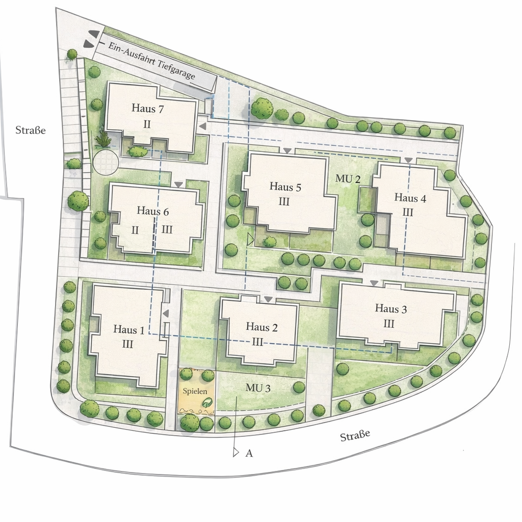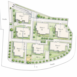 Auf dieser besonderen Fläche entsteht das grüne Wohnen in der Alte Gärtnerei mit 7 Gebäuden und individuellen Wohnungen. Die gesamte Parkanlage ist durch eine gemeinsame Tiefgarage mit Anbindung aller Objekte verkehrsbefreit.